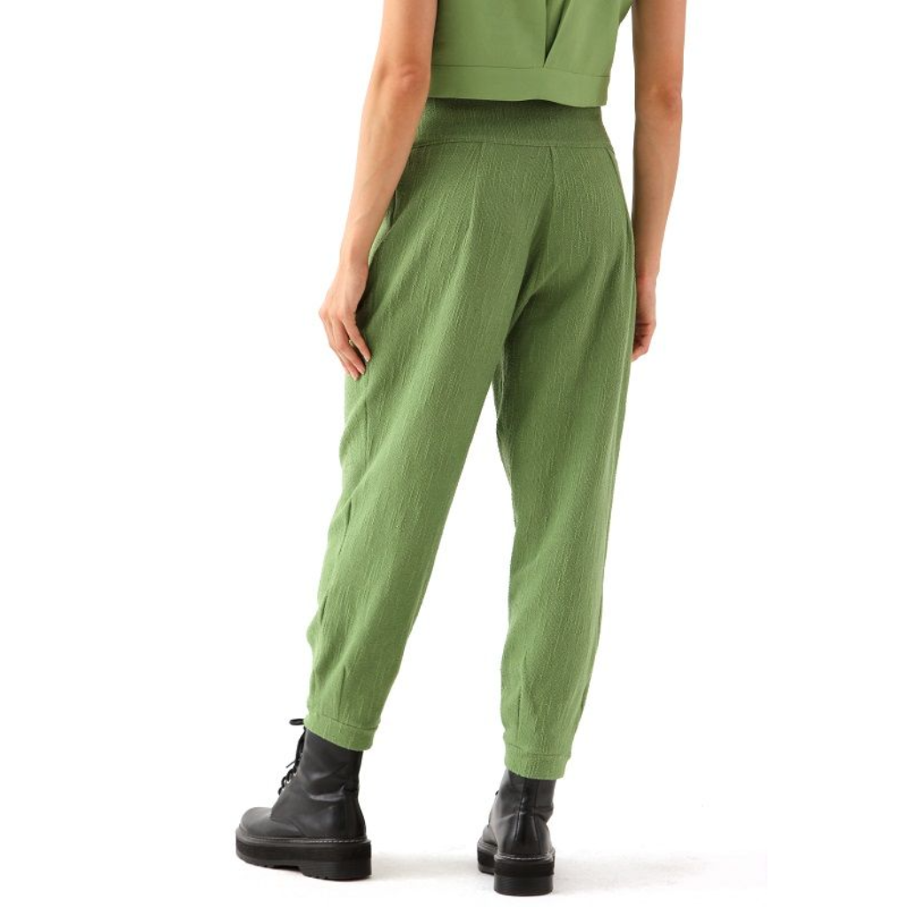 Calça confeccionado em moletinho atolalhado modelo jogger. Possui cintura alta com pala larga, detalhe de pregas na frente e fechamento por ziper lateral.