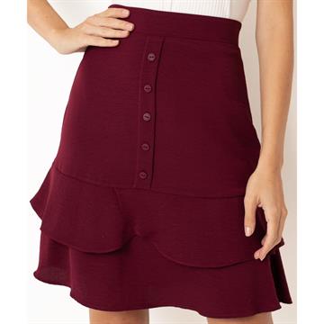 Saia modelagem curta detalhe botões frontal, barra com detalhe de babado e fechamento por ziper nas costas. Possui forro