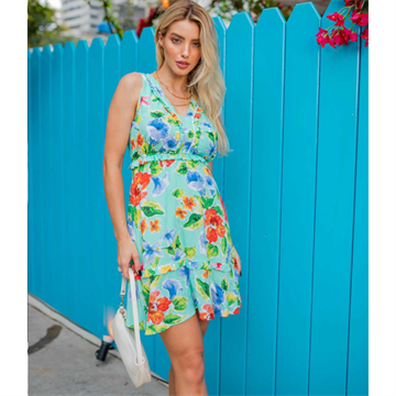 Vestido curto com estampa floral de toque suave e forro de malha. O modelo possui detalhe em vivo e babadinhos sob todo o decote e elástico abaixo do busto. Possui transpasse com amarração funcional posterior e barrado franzido com babadinhos frontais.