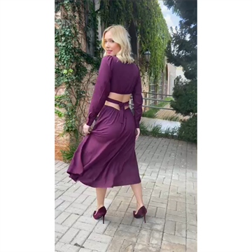 Vestido midi confeccionado em viscose com mangas longas, detalhes de recorte na cintura com fechamento faixa posterior e elastico na saia para melhor ajuste.